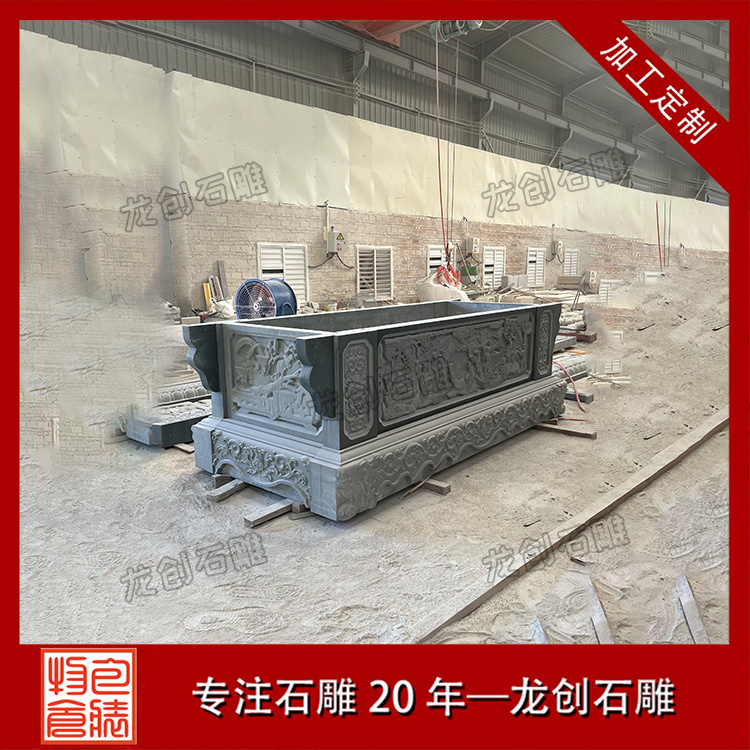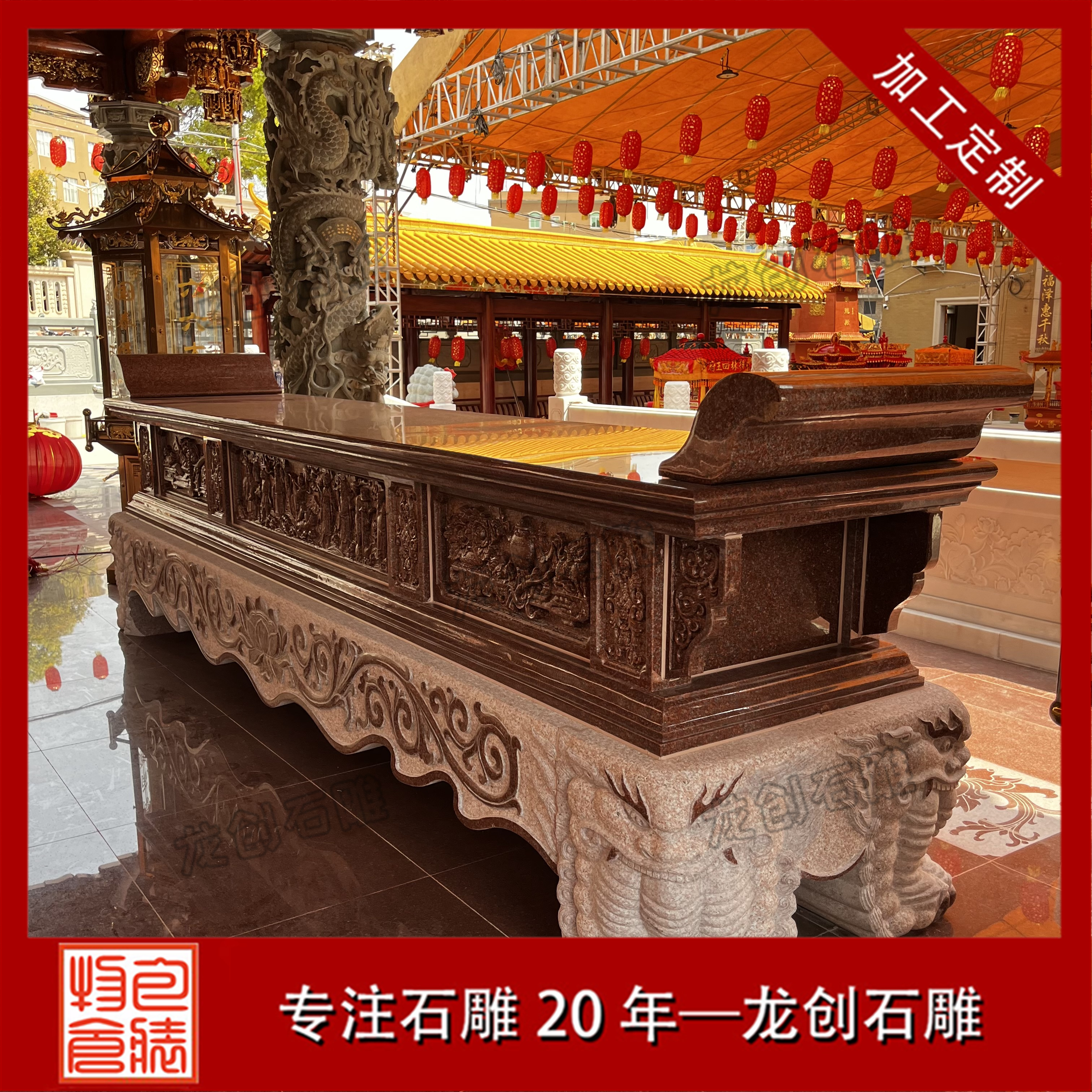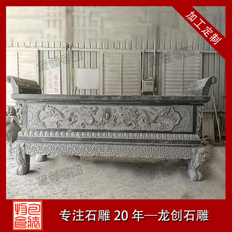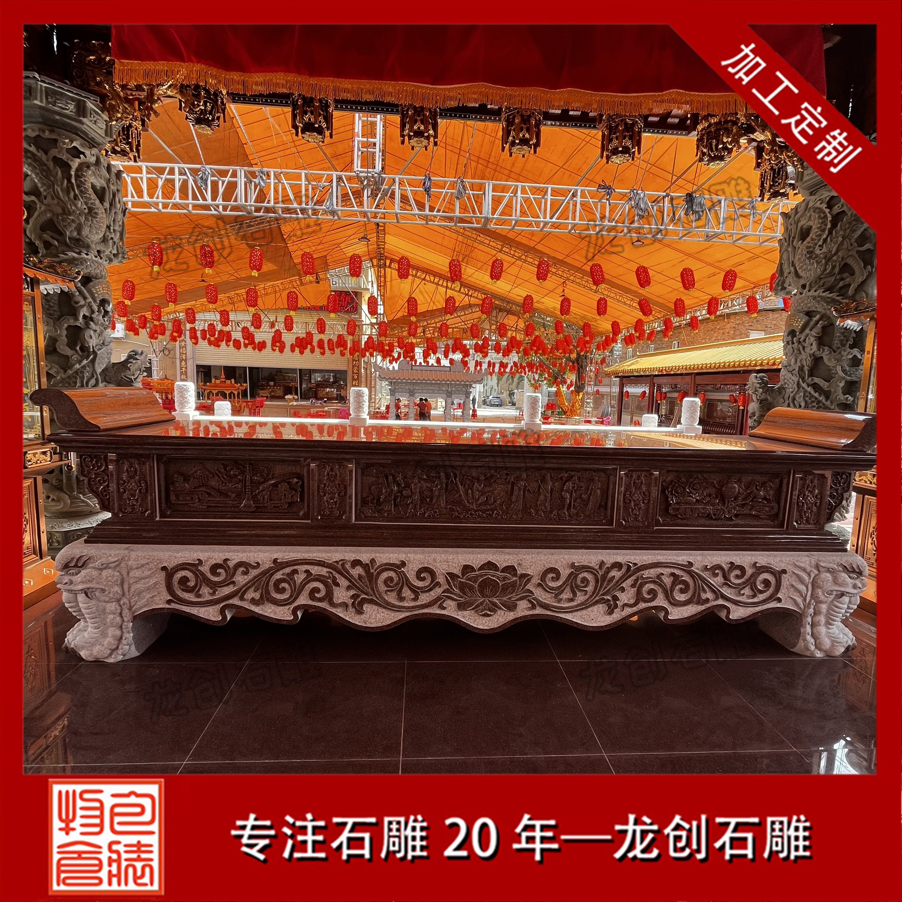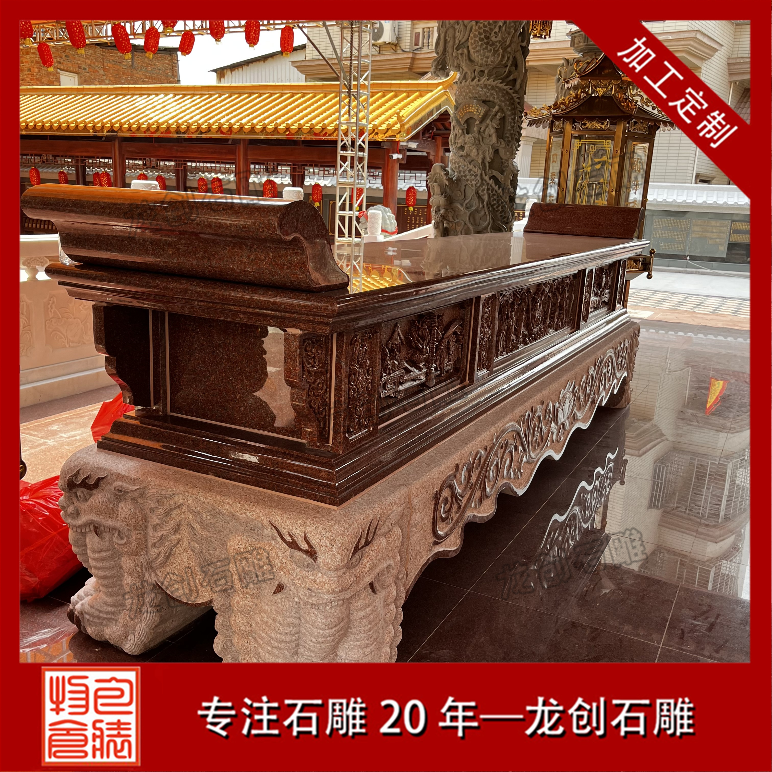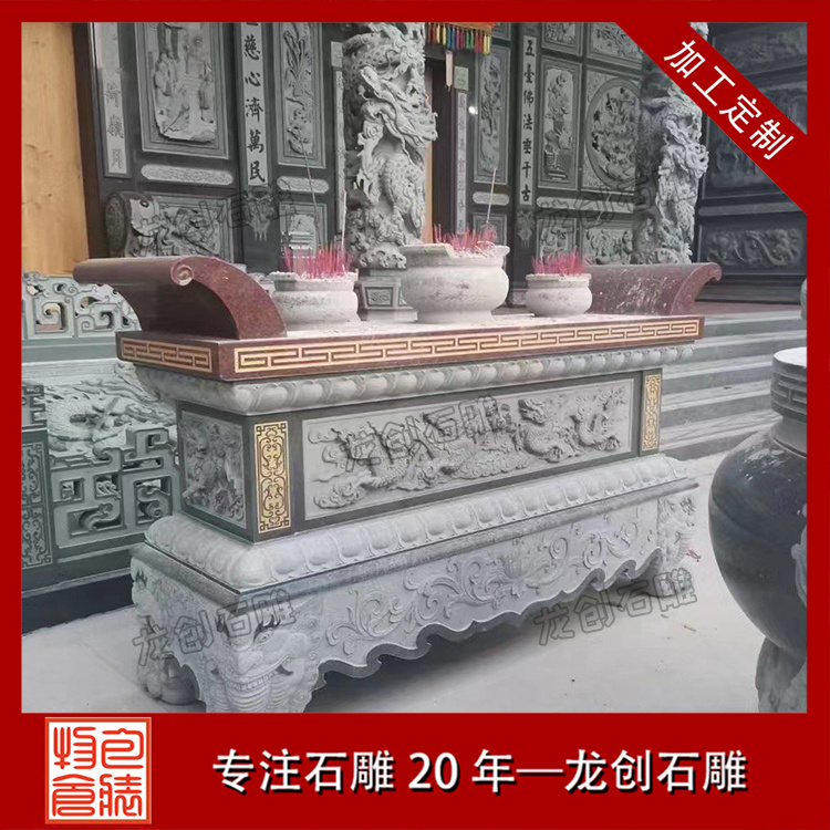 石雕供桌初用于祭祀、供奉,如今则更多应用于景观装饰、家居陈列。在园林中,它可作为石几摆放盆景;在茶室里,可作茶台使用;在庭院中,则能成为视觉焦点,增添古朴氛围。